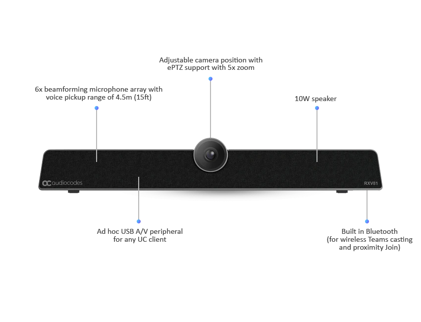 La RXV81 de AudioCodes es una barra de vídeo independiente para Salas de Microsoft Teams en Android™ (MTR) que eleva la simplicidad del plug-and-play a otro nivel, lo que provoca una experiencia de reunión de Microsoft Teams más amigable y excepcionalmente productiva.