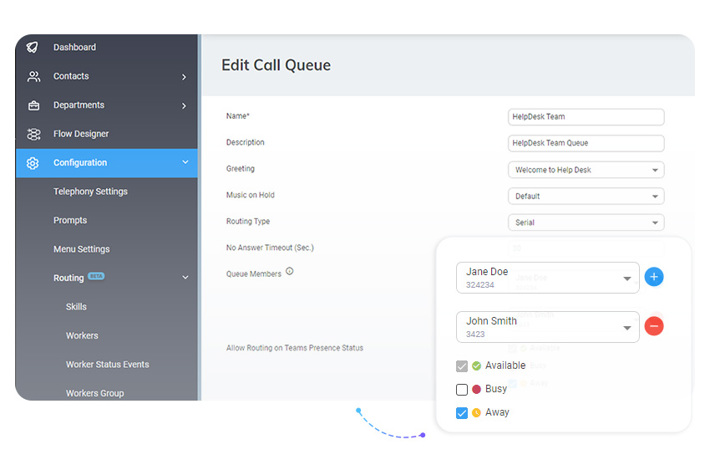 - Voca ofrece a los agentes informales la posibilidad de ser contactados a través de una cola, ser incluidos en enrutamiento inteligente con habilidades y presencia en Teams, o ser un destino IVR, todo ello sin dejar de utilizar Teams u otro sistema telefónico como su CU habitual.