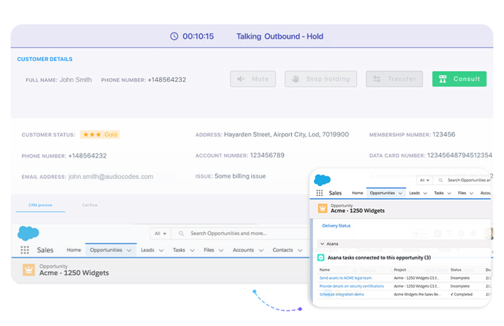 Estado de presencia de MS Teams, controles de llamadas dedicados, ventanas y datos de CRM integrados, y eventos de cierre personalizados.