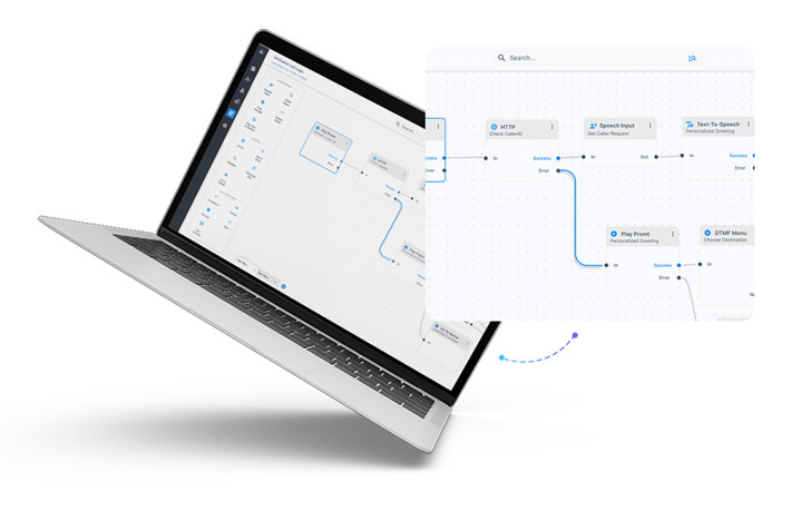 Automatice cualquier escenario de llamadas con funciones lógicas y solicitudes de API para obtener datos en tiempo real en un potente diseñador de flujos de llamadas sin necesidad de programación.