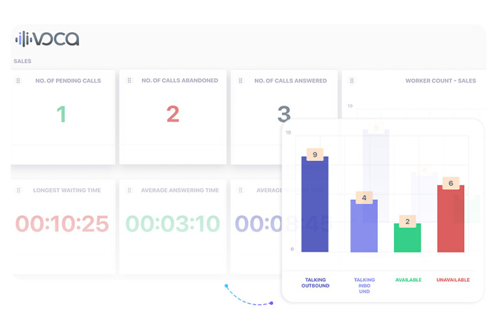 Un panel de control en tiempo real proporciona una visión instantánea de las llamadas pendientes, las estadísticas de abandono, los tiempos de espera promedio y el estado del agente para que pueda actuar rápidamente a fin de mantener los niveles de servicio.