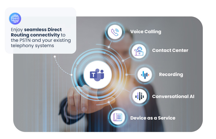 Complétée par des outils avancés d’automatisation et de gestion de l’onboarding, cette solution innovante basée sur le cloud fournit un routage direct fluide et une connectivité PSTN Operator Connect, ainsi qu’une gamme d’applications vocales supplémentaires.