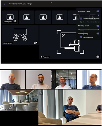 The new Composite AI feature enhances video conferencing on the AudioCodes RXV200 meeting room device by intelligently combining streams from two cameras into a single, cohesive layout. This innovation provides remote participants with an optimized, immersive view of both the meeting room and its participants.
