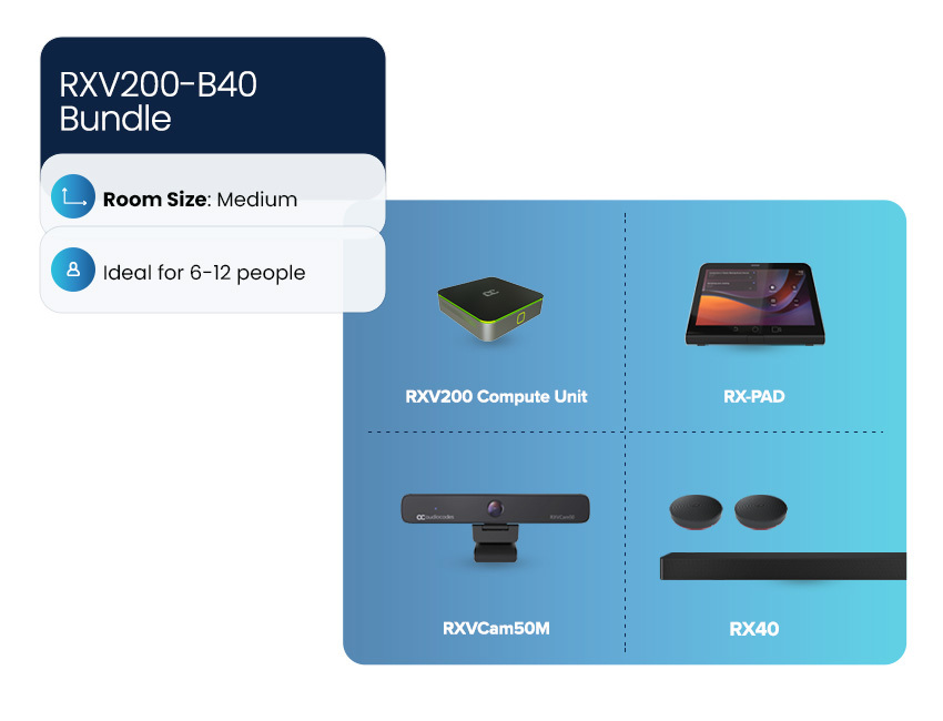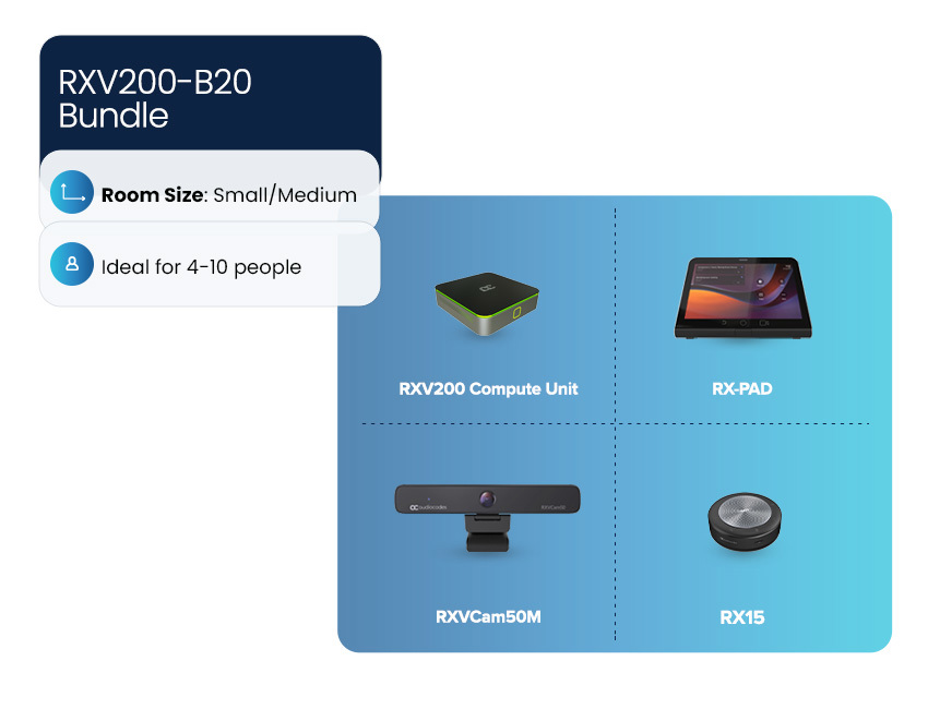 AudioCodes offers a range of predefined room bundles based around the RXV200 to offer optimal meeting experiences for different room sizes and configurations.