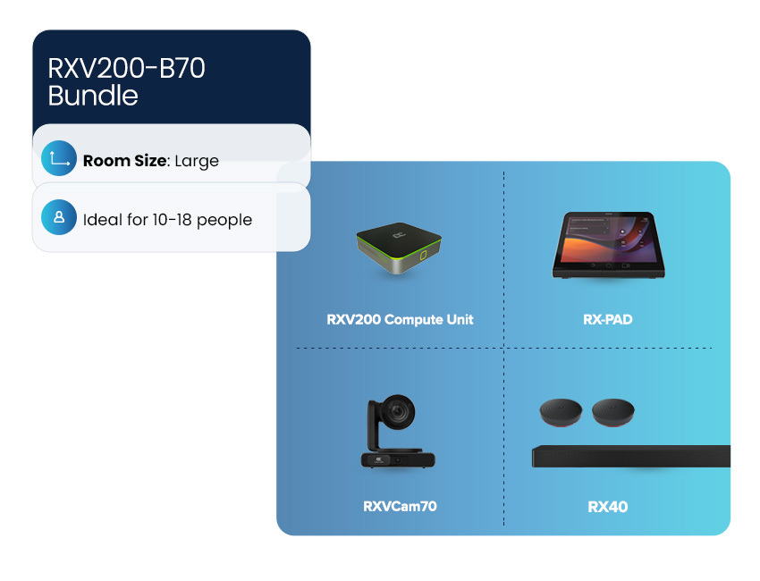 The RXV200-B70 bundle includes the AI-powered RXVCam70 dual-lens PTZ camera and provides an ideal solution for a truly immersive meeting experience in large rooms.