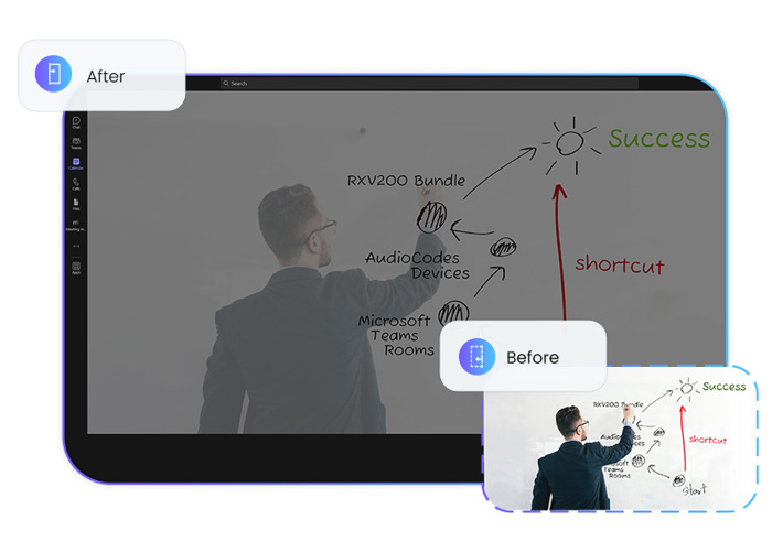 In conjunction with Microsoft Teams AI, the RXVCam10-CC offers intelligent whiteboard detection and automatically adjusts the frame to include the entire whiteboard. It also offers additional content enhancements such as image sharpening, contrast adjustment and overlaying a transparent view of the presenter.