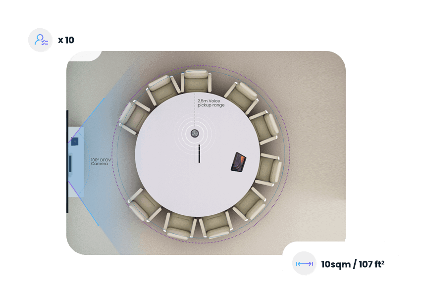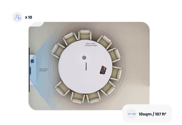 Room size: 10sqm / 107 ft2 | Participant capacity max: 10 | Voice pickup radius: 6m / 20 ft