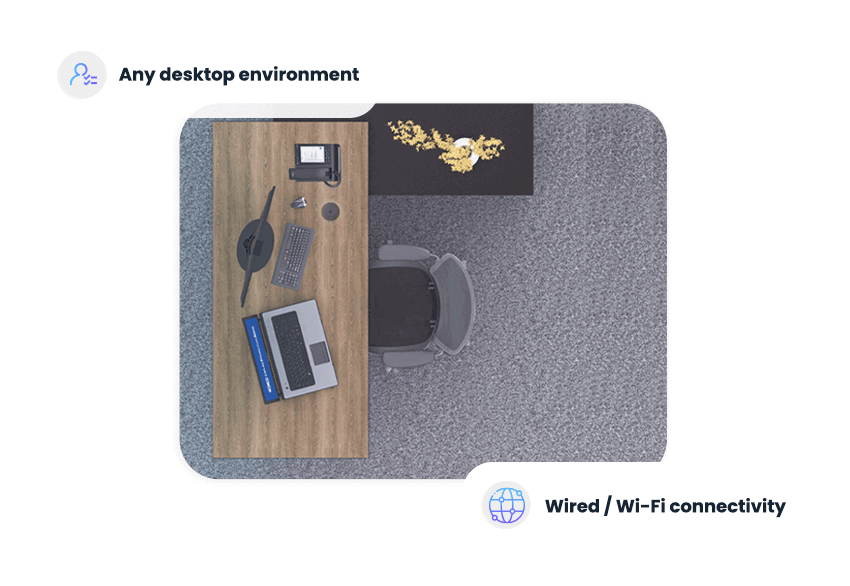 Room size: Fits any desktop environment | Connectivity: Works with wired or Wi-Fi connectivity