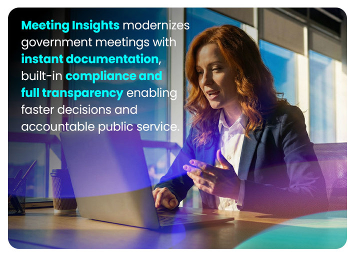 Local governments need faster, smarter ways to document meetings, track decisions, and maintain public transparency. Meeting Insights delivers AI-powered meeting intelligence designed specifically for the operational, compliance, and accountability needs of public-sector organizations.